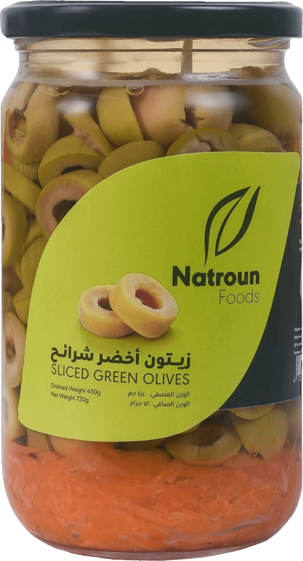 Pitted, sliced green olives cured in vinegar, salt and spices ready for your usage